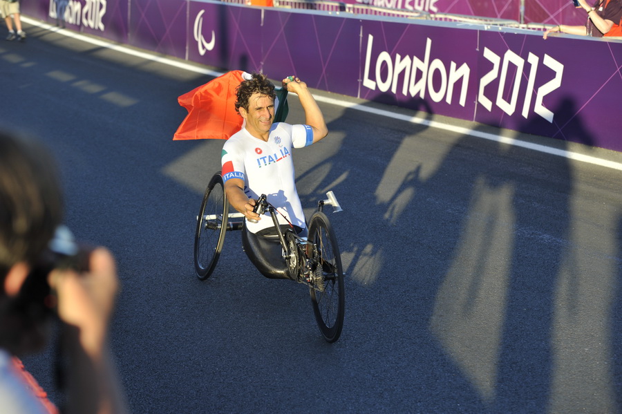 Le Paralimiadi di Londra. Londra è stata una esperienza magnifica, fantastica, che si è conclusa nel migliore dei modi con Zanardi che alza la sua handbike con una mano sola. Una foto non per nulla pensata, no, scusa, un gesto fotografato e per nulla pensato, ma estremamente efficace, perché io il giorno dopo presi in mano una copia del giornale, che credo fosse il Times, che aveva questa foto enorme in prima pagina e ne fui immediatamente colpito perché, non fossi stato io il soggetto ritratto, avrei detto: «È bellissima ’sta foto, foto più bella non potevano scegliere, perché è molto rappresentativa». […] Quindi essere stato il protagonista, anche se in modo involontario, di un gesto che ha lasciato chiaramente il segno, non tanto per quello che rappresentava tecnicamente e sportivamente parlando, ma in modo più ampio secondo me come espressione del sentimento paralimpico che a Londra è stato diverso, soprattutto nella percezione di chi ci ha guardato. Ecco, credo che lo sport paralimpico sia stato definitivamente sdoganato a Londra. Ed essere diventato in qualche modo uno, non l’emblema attenzione, perché ci sono state imprese meravigliose che devono essere raccontate e che molti già conoscono bene perché sono state imprese fantastiche… Eppure essere stato uno degli emblemi di quella Paralimpiade è una cosa che resterà per sempre parcheggiata nel mio cuore.